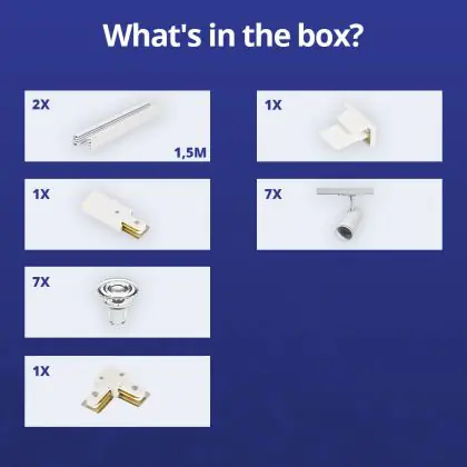 | Fabrikantnaam | Complete L shaped 1-Phase Track Set White incl. 7x Spot fixture + GU10 2700K 3W Dim – 1.5 x 1.5 mete | |