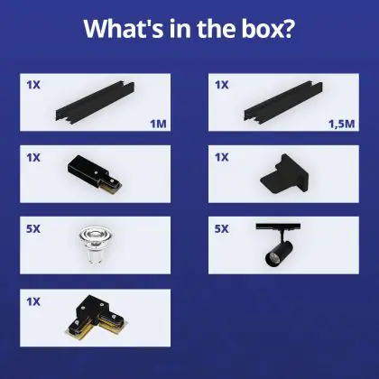 | Fabrikantnaam | Complete L shaped 1-Phase Track Set Black incl. 5x Spot fixture + GU10 2700K 3W Dim - 1 x 1,5 meter | |