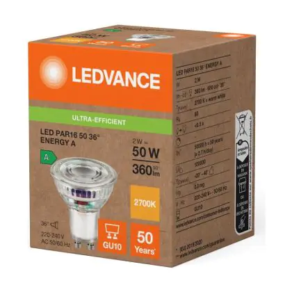 Beschrijving Ledvance LED PAR16 GU10 Reflector 2W 360lm 36D - 827 Zeer Warm Wit | Vervangt 50W