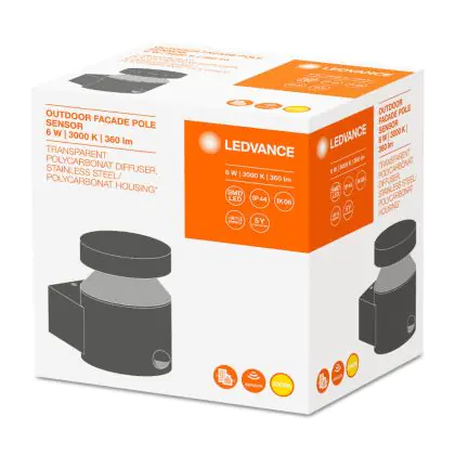 Beschrijving Ledvance LED Wandlamp Buitenverlichting Facade Pole 6W 360lm - 830 Warm Wit | Bewegings- en lichtsensor
