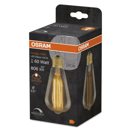 Beschrijving Osram Vintage 1906 LED E27 Edison Filament Gold 8.8W 806lm - 822 Extra Warm White | Dimmable