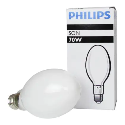 De Philips SON is een diffuse hogedruk natriumlamp en is verkrijgbaar met en zonder interne ontsteker. De Philips SON 70W 220 I E27 is een 70 gasontladingslamp met een E40 lampvoet. De lampvoet maakt het zeer gemakkelijk om uw lamp te vervangen. U kunt de lamp eenvoudig in het armatuur bevestigen.